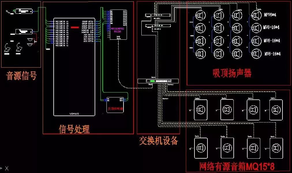 MQ-15為15寸有源音箱,通過Dante傳輸進入主交換機;MVP6內(nèi)置功放Dante網(wǎng)絡傳輸?shù)奈斠粝洌恐晃斃韧ㄟ^音箱線并聯(lián)三只MV6-16,最終通過一根網(wǎng)線進入系統(tǒng)MR-4RP交換機,同時給MVP6吸頂24V供電;MR-4RP通過網(wǎng)線連接主交換機。調(diào)音臺輸出模擬信號給音頻處理器,音頻處理器通過網(wǎng)線連接主交換機,無需輸出模擬信號,通過Dante網(wǎng)絡傳輸協(xié)議進行數(shù)據(jù)處理。最終以Dante controller軟件進行通道配備選擇。