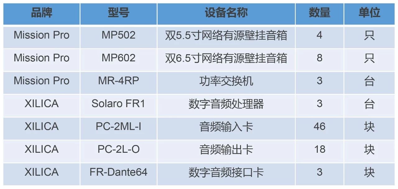 考慮到該項目的實際需求,前期結合工程圖紙與項目方進行了充分溝通,通過與同類產品的多次對比、多次測試,最終選擇了先歌國際旗下擁有40多年先進技術經驗的英國知名音響品牌——Mission Pro美聲網絡音頻系列產品,以及專業從事設計、研發和生產高性能DSP音頻處理系統17載的國際知名品牌——加拿大XILICA Solaro FR1高端數字音頻處理系統。