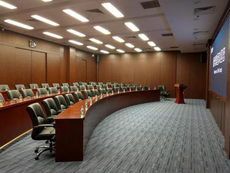 410董事局會議室長11.77m、寬6.8m、高2.8m,面積約80㎡,可容納坐席31個,主要用于董事局內部會議、工作匯報、日常會議等。