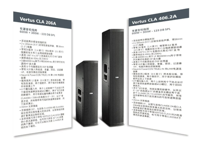 相比傳統型的兩分頻揚聲器,Vertus CLA系列音箱在觀眾聽音區域的頻響更加平坦均勻,不論是在室內還是室外等混響多,聲學條件苛刻的情況下它都能很好的展現自己的特性。CLA的柱面波能夠精準地投射和還原音源信號的內容,效果出眾,臨場感強。對于話筒產生的反饋也有很好的抑制。