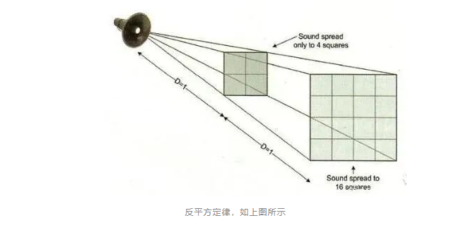 如果距離聲源的距離每增加一倍,那么聲功率就會(huì)減少為原來(lái)的四分之一,我想這一點(diǎn)很多人都是知道的。這一定律幾乎可以適用于所有的地方,無(wú)論是麥克風(fēng)還是揚(yáng)聲器陣列。了解這一定律,對(duì)于我們確定功率放大器所需的功率十分重要。