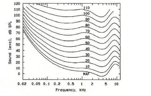 換句話說(shuō),如果我們想讓100 Hz的音調(diào)與3.5 kHz的音調(diào)聽起來(lái)一樣大,100 Hz時(shí)的聲音必須比3.5 kHz時(shí)的聲音大上15 dB!(這里我們假設(shè)3.5 kHz的音調(diào)為85 dB SPL)
