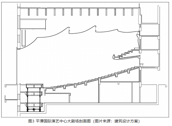 平潭國際演藝中心位于福建省平潭綜合實驗區,面朝開闊的海灣景觀。建設用地面積約31 374.21 m2,建設總建筑面積 3 8 9 7 2 . 8 7 m 2 ,其中地上建筑面積26 907.21 m2,包含大劇場、多功能廳、公共文化中心和公共服務配套等,地下建筑面積12 065.55 m2。大劇場及多功能廳配置了先進的聲光電設備,同時,這兩個廳堂也都進行了專業的建筑聲學設計。先進的舞臺設備及優良的建聲設計,使得平潭國際演藝中心完全可以滿足國內外大型歌劇、舞劇、綜藝、話劇、戲曲等節目的演出需求。平潭國際演藝中心的建成投用,提升了平潭國際旅游島的知名度和影響力,也將對兩岸文化藝術交流與合作發揮重要的促進作用。圖1為平潭國際演藝中心效果圖。