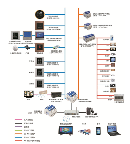 基本功能:照明開關、電動窗簾開合、插座控制、空調本地控制、空調聯網控制、背景音樂控制、模式控制、房態監視。