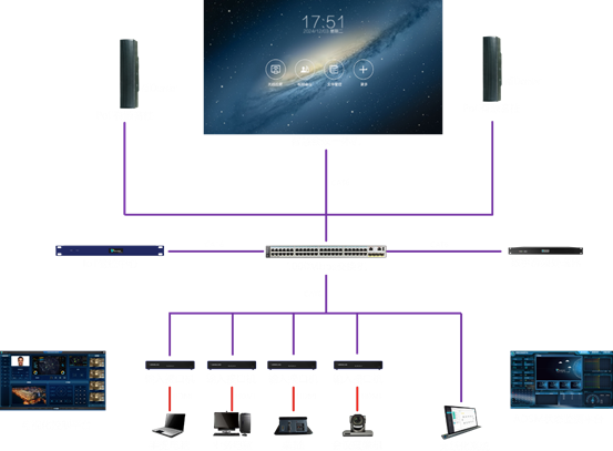 分布式音視頻系統能實現PC軟接入,授權安裝軟件在電腦上以后,電腦信號即可作為信息輸入進入交換網絡,供其他設備分配或者調用。并可在人機控制界面上控制電腦上的播放軟件,如暴風影音等; 在授權電腦或者安卓設備或者ios設備安裝軟件后,即可從電腦或者其他平臺軟件觀看到所有接入本交換網絡的所有輸入信號,非常容易的實現了高清分割的功能,人機友好得到極大的提高,大大提高了對大型會議調度人員的配合程度。
