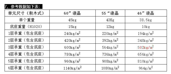 注意:用戶需根據(jù)大屏幕顯示系統(tǒng)設(shè)備的總重量,看現(xiàn)場(chǎng)系統(tǒng)設(shè)備安裝區(qū)的樓層承重是否能滿足設(shè)備的承重要求,如不能滿足要求,必須請(qǐng)專業(yè)公司對(duì)樓層承重進(jìn)行加固處理。
