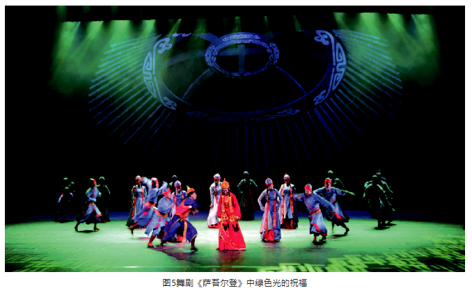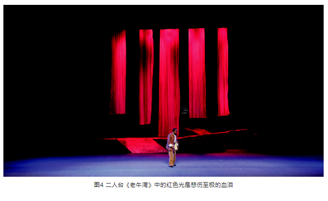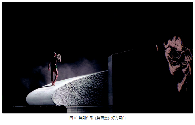 另外,在光位的選擇上,盡量選擇側光位,側光位的光束要較逆光弱一些。光區的邊界在沒有特殊要求的情況下,盡量以柔光斑虛化處理,避免硬光斑的清晰邊界。燈光色調要與舞美統一,表演空間光比關系層次分明、把握準確。特別是景光,在舞美沒有給畫面“留白”的情況下,有的景片可以作無光處理,用不給光來實現舞臺畫面“留白”,這樣才能保持畫面的完整性。見圖9、圖10。