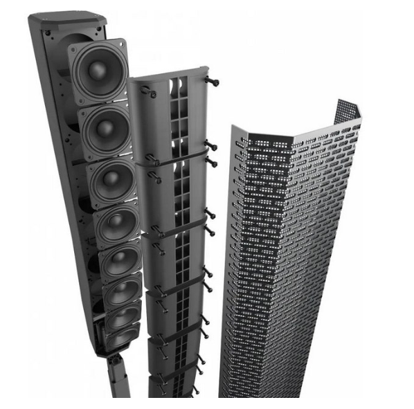 陣列的外箱由耐用的復(fù)合材料制成,并配有符合人體工程學(xué)的鋁制把手。超低音采用15mm木制外箱,里面含有一個(gè)12寸低音單元,采用高效的層流通風(fēng)口設(shè)計(jì)。陣列和超低通過(guò)對(duì)稱的鋁桿與內(nèi)部布線和磁吸閂鎖連接。揚(yáng)聲器裝有一個(gè)黑色粉末噴涂的18 gauge標(biāo)號(hào)鋼制網(wǎng)罩作保護(hù)用途,還包含一個(gè)陣列/拉桿運(yùn)輸箱。先進(jìn)的D類放大器可提供高達(dá)1,000W的功率。